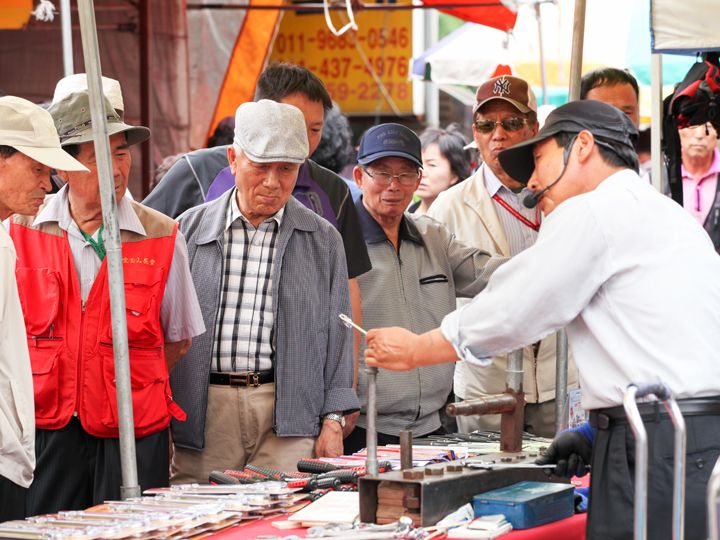 「牡丹(モラン)市場」は、ソウル首都圏最大の五日市場で、毎月4と9のつく日のみ5日間隔で開かれます。京畿道(キョンギド)の城南(ソンナム)市にあり、数え切れないほど多くの店がひしめきあう様子は全国的に知られています。以前から移転が話題になっていましたが、2018年にかつての駐車場の南側の位置に移転が完了しました。種類が豊富な生鮮食品から服や靴などの雑貨まで多様な商品を取り扱い、一般の買い物客はもちろん、小売店を営む人も買い付けに来る卸売市場でもあります。手打ちカルグッスや韓国版ちんどん屋の「カクソリ」、そして絞りたてのごま油などが3大名物として知られ、各地から多くの人が訪れます。特に駅周辺にはごま油通りがあり、人気です。