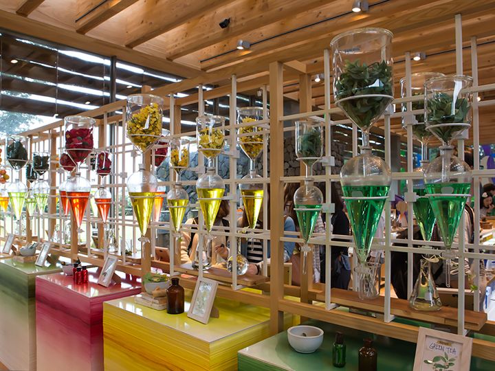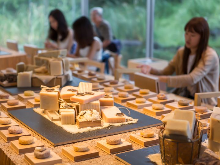 中に入ると左手に石鹸作り体験コーナー、正面に化粧品のショップ、右奥にカフェがありました。