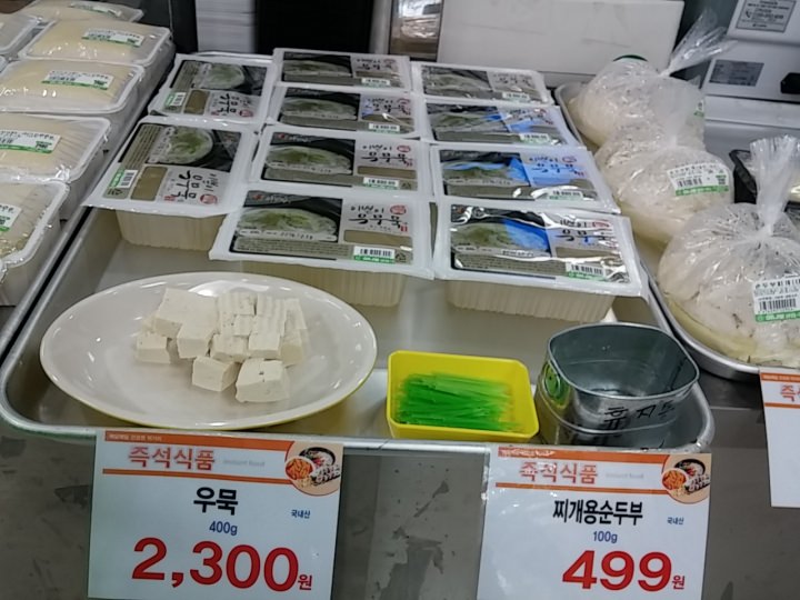 木綿豆腐程度の堅さの、手製っぽい姿の豆腐が半丁(日本の1パックくらい)2100ウォン、1丁3980ウォン。1階で扱う大手メーカーの市販豆腐(1パック1000ウォン程度)の倍程度の値段です。が、風味濃厚で、美味ではあります。