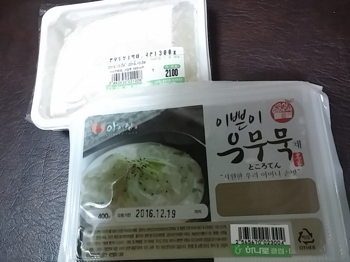 「チゲ用スンドゥブ」や、郊外のカルグッス・マンドゥ屋などで売られているような「豆腐菓子」スナックもそれなりに美味しいのですが、注目すべきは「トコロテン(2300ウォン)」です。「直方体ではなく、麺のような姿でパック売り」を扱う店は、韓国ではさほど多くありません。