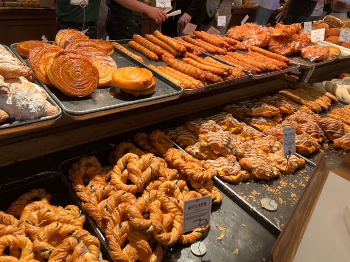 女性客が多めで、外国人客の姿も見られ、雰囲気的には「高そう」ですが(実際、高い商品もありますが)価格はおおむね、韓国のパンチェーン店P社やT社と変わりません。ちなみに、私の好物は「クリームパン 1000ウォン」や「もち米おにぎり 1500ウォン」です。
