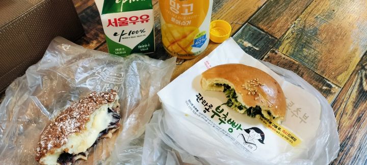 パンタロンプジュパン(にらパン)2000ウォンと、クリーミーチュソ(クリーム入り揚げあんぱん)2800ウォンを買い、ホテルへ持ち帰って食後のおやつとして食べました。