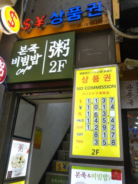 レートはyahooで調べた市場レートが100円あたり1017ウォンのところ、1014ウォンと悪くなかったです。前日に行ったソウル駅の両替所は1006ウォンでしたので、比べたらかなり良いかと。お店が閉まっていて、さてどうしようと思いましたが、斜め前にあるセブンイレブンで同じ1014ウォンで両替をしていたので、そちらで替えました。他にも同じレートの両替屋さんが10m以内にありましたので結果として、閉まっていても全然困りませんでした。(*^^*) -