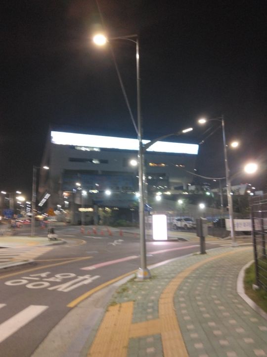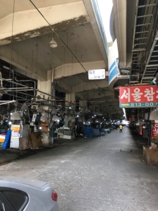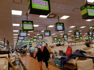 正面に綺麗な建物の鷺梁津水産市場が見えます。