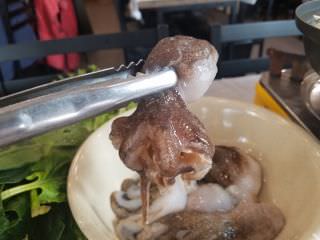 2階の店に案内してもらい、ヨンポタンとチャミスルを注文。間もなく皿に入った4匹のチュクミと野菜が入った鍋がテーブルにセットされます。鍋が煮えたところで、トングで生きたチュクミをつかみ投入。おばちゃんがハサミで足を切ってくれ、頭は良く煮えてから食べろとの指示。