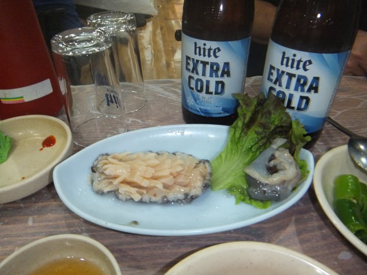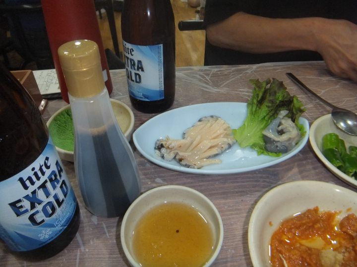 あさりは鍋(薄味ですがあさりの味がでていて想像より美味しい)に、アワビはバター焼き(キモついてました)、エビは塩やき、タコは刺身で75千wonでした。よく考えると高い気もしました。