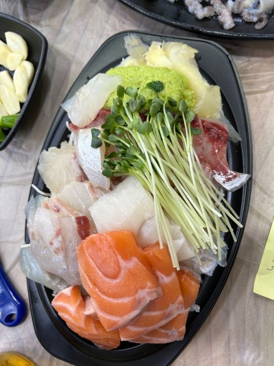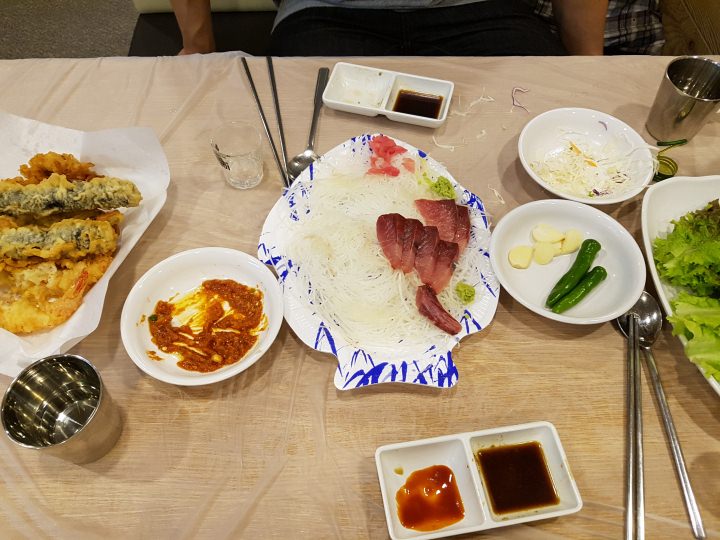 日本とは違った薬味で食べる刺身いいですねえ。にんにく&味噌&ゴマ油が美味い!
