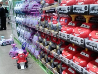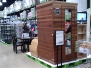 広~い店内には「24個入り」「2リットル×6本」など、まとめ買い数量の生活雑貨や食品が並んでいます。乗るタイプの玩具が数十台、アップライトのピアノ複数台、個人用サウナ(!)など、その広さを活かした大物商品も目立ちます。