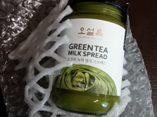 オミジャ茶でも買うかと寄ってみたのですが、「緑茶ミルクスプレッド(8500ウォン)」というのが目にとまり、結局これを1瓶購入。ペースト状の、パンなどに塗るスプレッドです。