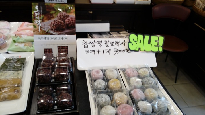 景福宮駅から通仁市場方向に歩いていた時、餅店「ピジュン」で餅のセールに遭遇。シンプルな餡入り餅(1個1000ウォン)が4個3000ウォンとのことです。