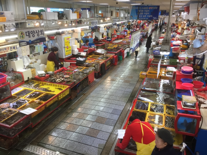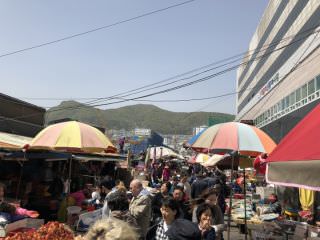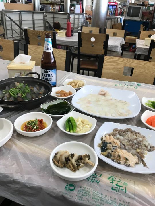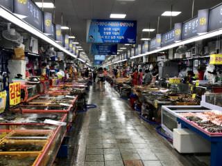 どうせならチャガルチの屋台通りで夕方から食べたほうが良いかと思います。貝類、魚介類はキッチリ料理(生、焼き、貝鍋)してくれるし仕入れが新鮮なので市場で食べるのと変わりません。