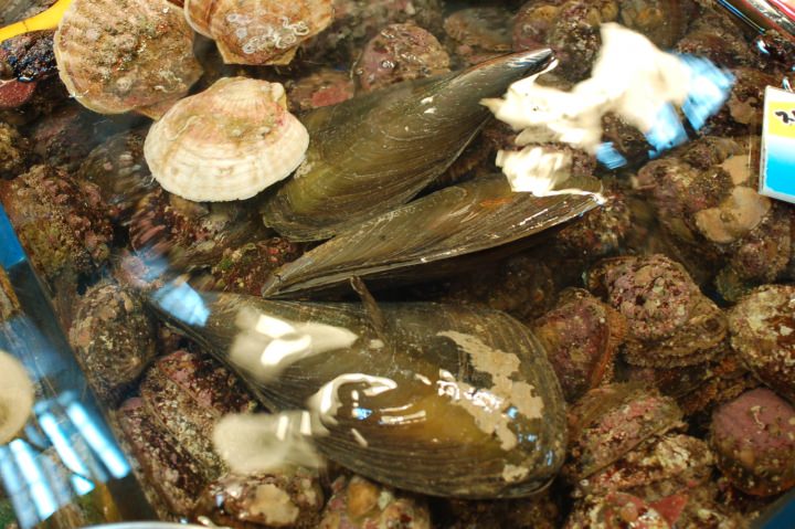 まずは場外を散策。陳列するのも相当大変だろうと思う位タコだの貝だの魚だの並んでます。そしてアジュンマ達の勢いの良いことw