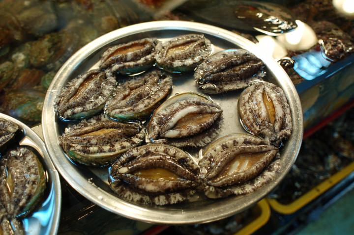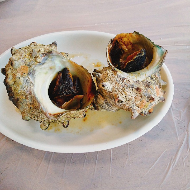 アワビ小さめ2個で1万ウォン。1つは刺身、1つはバター焼き。