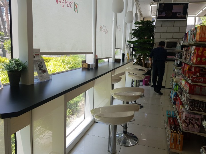1階は、一般的なコンビニでして、窓側には簡単に食事ができるカウンターがございます。