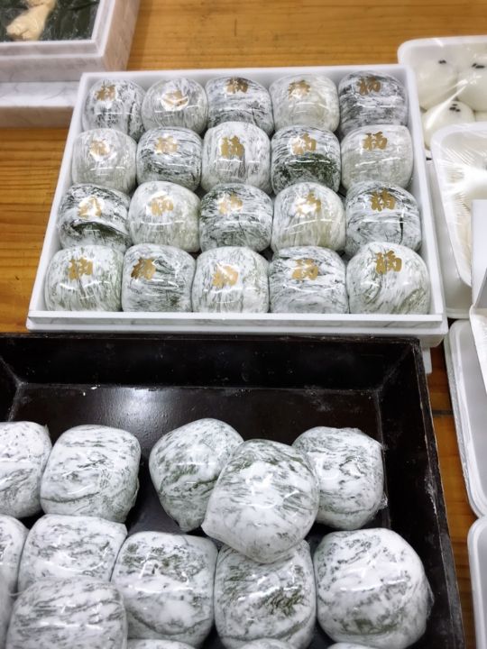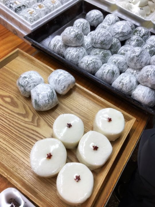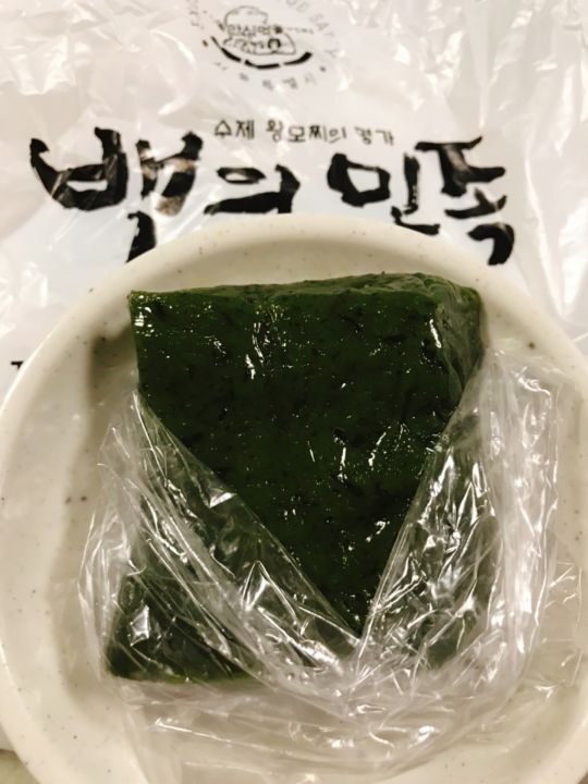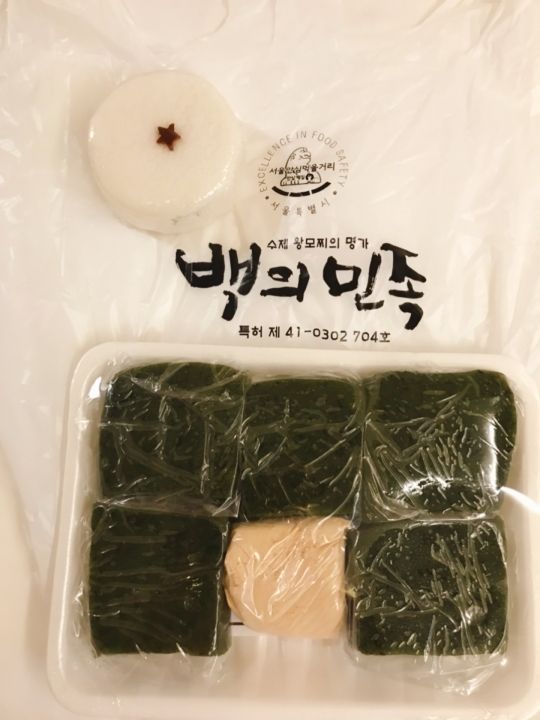濃い緑が美しく光るヨモギ餅と赤ちゃんの100日祝いのペッソルギ(백설기)を買ってみました。