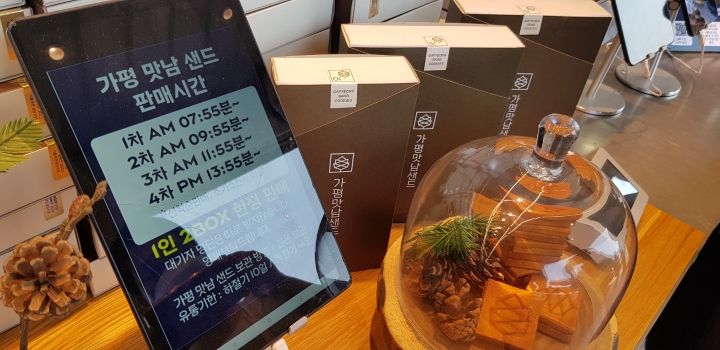 加平の特産品である松の実を練り込んだバタークッキーに、生クリームとソルティキャラメルをはさんだ、'맛남샌드'。