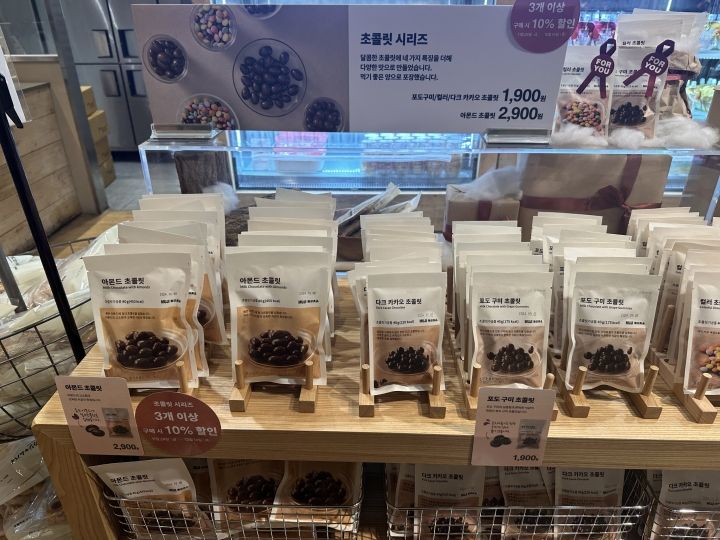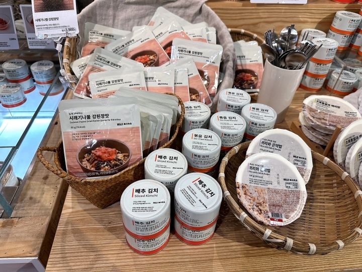 1階は食品系でカフェやパン屋さんのほかに、きなこのお菓子、薬菓、韓国のキムチ、レトルトスープとかが売っていて、お土産によさそう。スープは1箱5個入りとかで私もよく飲んでいます!レジは有人と無人セルフレジの2つがありました。
