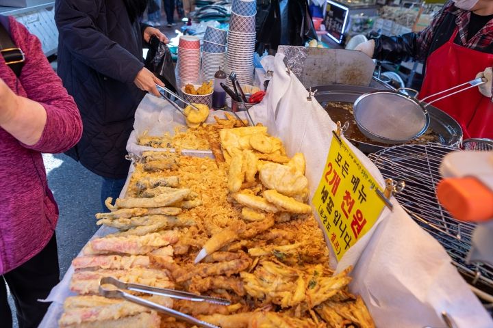 富平缶市場にも様々な屋台の食べ物が並んでいますが、人気が高い中の一つが「屋台の手作り天ぷら」です。