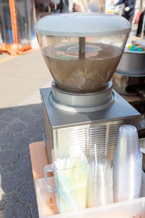 屋台で社長が続けて天ぷらを作って、手前に並べたらお客さんがセルフで入れてお会計をするやり方です。