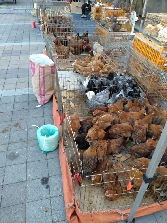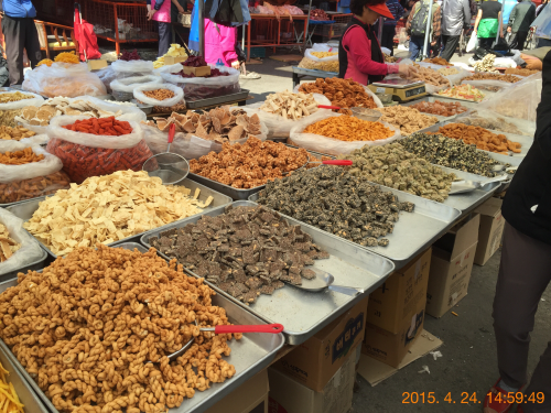 花、穀物、野菜、果物、魚、肉、餅、お菓子、衣類、日用品を始めペット用の子犬•子猫などの動物や、食用の鳥や犬も販売されています。この辺りには食用犬を使ったボシンタンという料理のお店も沢山あります。精がつくと昔から食べられている犬鍋です。他の市場や観光地では恐らく食用犬もボシンタンのお店もなかなかお目にかかれないかもしれません。