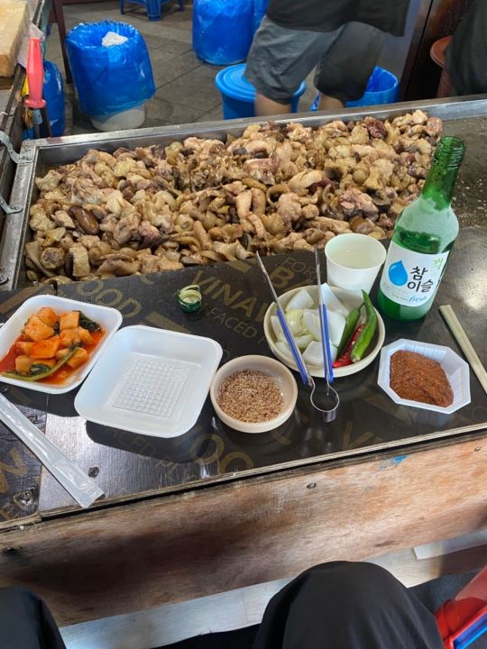 その中でも、豚のホルモン焼き食べ放題(4〜5店)が有名です、 昼時は混雑するらしく、朝7時過に行きました、 席に座ると飲み物(焼酎、ビール、マッコリ、コカコーラ、チルソン)1本を選びます、 直ぐにキムチ、玉ねぎ、唐辛子、トングが運ばれてきます、トングで小皿に取って食べます、 この日の為に1ヶ月豚肉を我慢してたので、本当に美味しかったです、 鉄板一杯の肉の中から食べ頃の肉を店主が私の前に持ってきてくれます、 キムチ、玉ねぎも食べ放題で、 追加の飲み物が5000wです、 脂が跳ねるので、エプロンもあります、