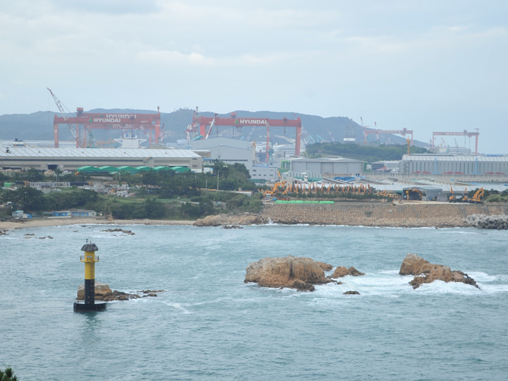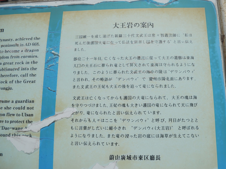 工業都市・蔚山(ウルサン)の海沿いにある「大王岩公園(テワンアムコンウォン)」は、蔚山12景にも指定されている美しい海浜公園です。公園の入口にある樹齢100年を越える松林の遊歩道を抜けると、晴れた日にはエメラルドグリーンに輝く美しい海が広がり、大小様々な形の岩が確認できます。中でも最も大きな岩が大王岩と呼ばれており、新羅の文武王(ムンムワン)の王妃が「死後も龍となり国を守る」と言い残し、大王岩の下に埋葬された、という伝説も残っています。公園内の小高い丘の上には登録文化財にも指定されている「蔚山蔚崎灯台旧灯塔」もあり、海辺散策にピッタリの公園です。