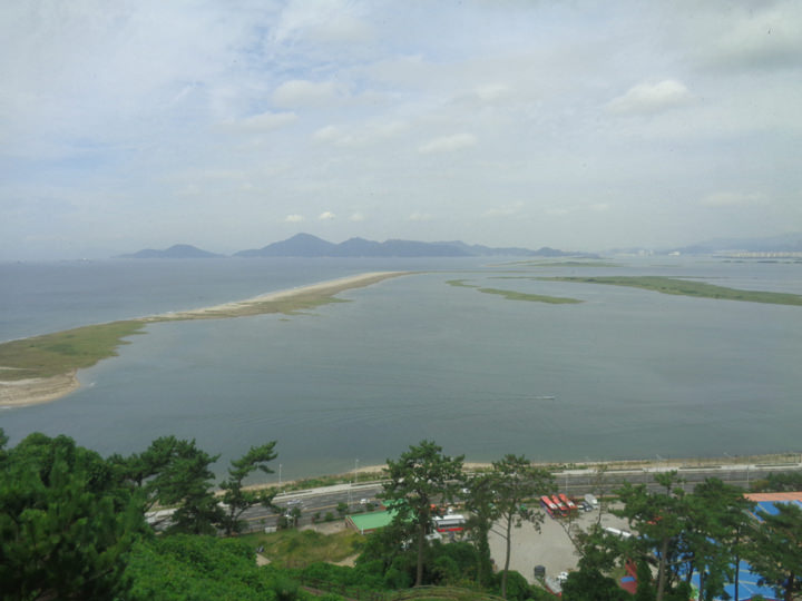 展望台から俯瞰する洛東江の河口付近は、海と川が出会う部分なので、大きな干潟や砂州が幾つもあり、水鳥が羽を休めています。