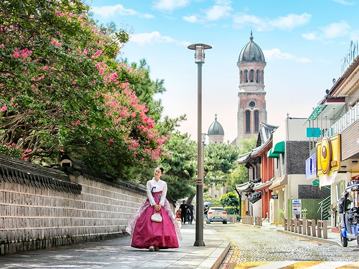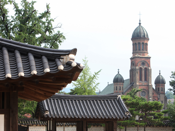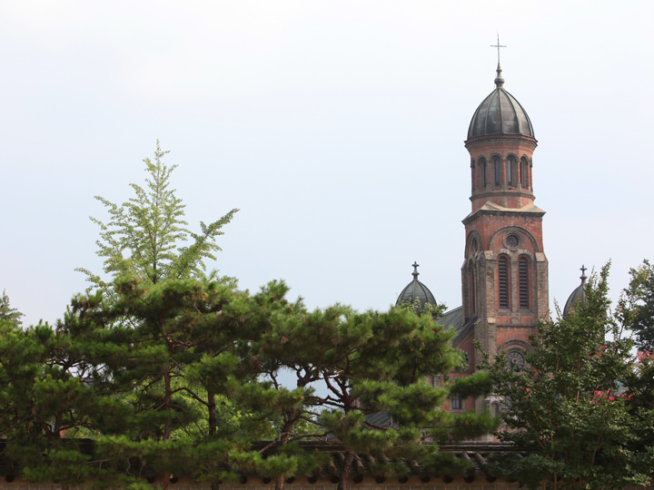 「全州殿洞聖堂(チョンジュ・チョンドン・ソンダン)」は、韓国最初の殉教者を称えるために1914年に造られた聖堂です。韓国西南部の西洋式近代建築物の中でも規模が大きく、歴史のある建物の1つ。赤レンガで造られた聖堂はロマネスク様式を主調に、ビザンチン様式も加えられ、韓国で最も美しい建物だと言われています。「全州韓屋村」の各地から眺められ、特に向かいにある「慶基殿(キョンギジョン)」の敷地内からは韓国の韓屋と西洋の近代建築の調和を楽しむことも。外観だけでなく聖堂内部も見学はできますが、ミサ中は見学できません。またミサの時間以外でも信者が礼拝をしている場合もあります。