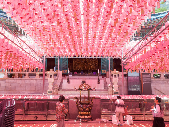 お寺にはピンクの提灯が沢山下がり信仰の厚さを感じます。