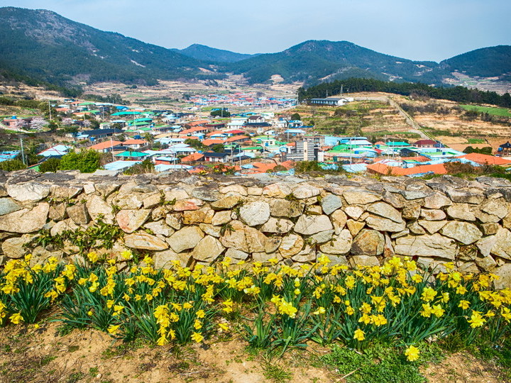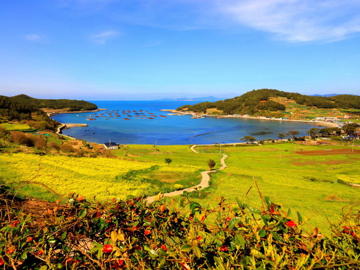 全羅南道(チョルラナムド)の南海岸に位置する莞島(ワンド)の港から、船で南へ約1時間の距離にある離島のひとつが「青山島(チョンサンド)」です。地名の漢字の通り、青い海、青い山、段々畑、石垣など島内では島ならではの独特の文化が垣間見られ、2007年にはアジア初となる「スローシティー」に指定されました。日本からの観光客には、2006年に放送された韓国ドラマ「春のワルツ」のロケ地としても知られ、毎年4月中旬から下旬にかけて島全体を黄色く彩る菜の花畑の丘の上には、ドラマにも登場した白い家のオープンセットがあって、記憶に残っているドラマファンもいることでしょう。島を一周するトレッキングコースも人気で、所々に大海原を眺める展望台が設置されています。