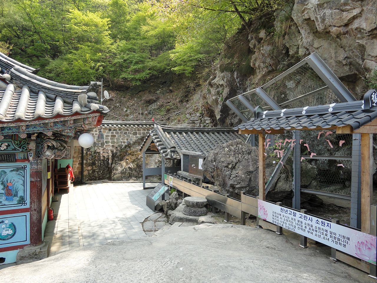 寺名は、背後の岩壁に希少植物「皐蘭草(コランチョ)」が自生していることに由来し、皐蘭草はシダ類の一種で、済州島では「不老草」とも呼ばれています。創建時期を示す明確な記録は残っていませんが、百済時代の楼閣説や宮中内仏殿説、高麗時代に三千宮女の霊を弔うため建立されたという伝承が伝わります。境内裏手には薬水「皐蘭泉(コランセン)」が湧き、1984年には一帯が「忠清南道 文化財資料」に指定されました。