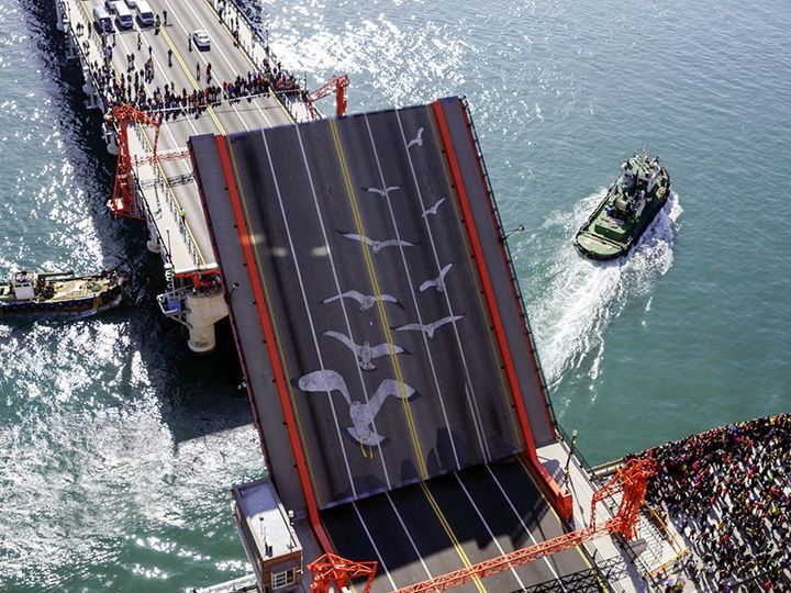 橋が完全に開ききったところで、橋の正面に移動しました。車両通行止めになっている車道は撮影のために立ち入りOKです。道路にはカモメのイラストが描かれており大きなキャンバスといったところでした。