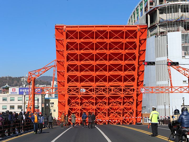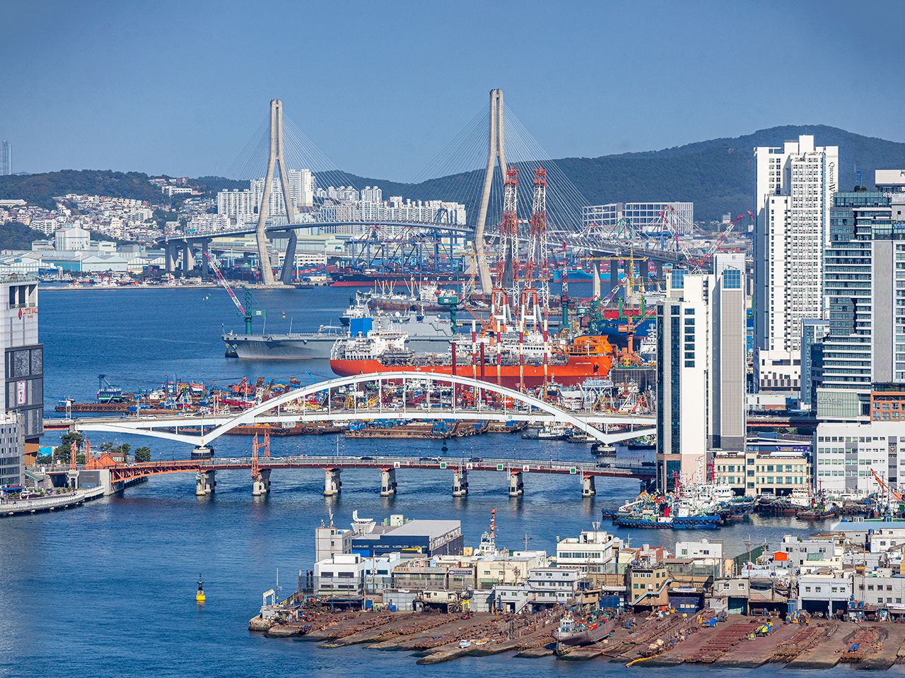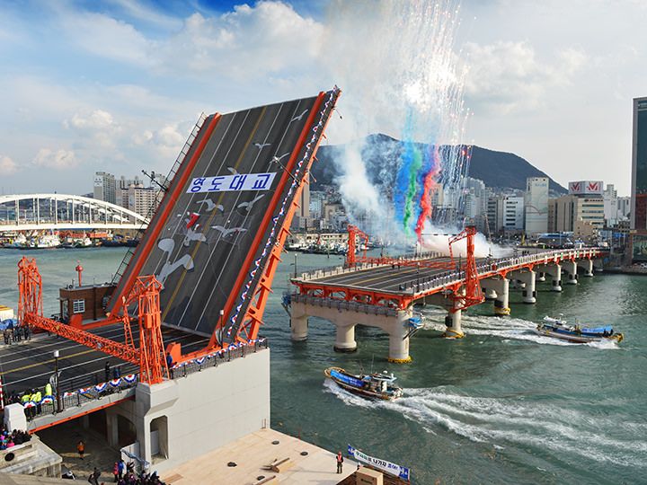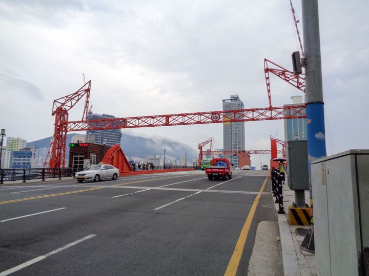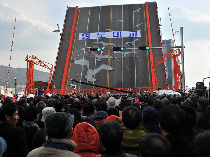 「影島大橋(ヨンドテギョ)」は、釜山(プサン)の繁華街・南浦洞(ナンポドン)と影島(ヨンド)を結ぶ橋として1934年に完成しました。港町で船の往来が多いことから橋が可動する「跳開橋」として建設。朝鮮戦争時にはこの橋を渡って多くの避難民が影島へと渡ったと伝えられています。1966年までは船の往来に合わせて橋が開いていましたが、以降は交通問題などにより跳開することはなくなりました。現在は観光イベントとして毎週土曜の14時に橋が開きます。市民・観光客に人気で14時前になると橋が見える「チャガルチ市場」周辺のデッキや、「釜山タワー」展望台、「ロッテ百貨店」屋上にはカメラを持った人たちが集まりはじめます。