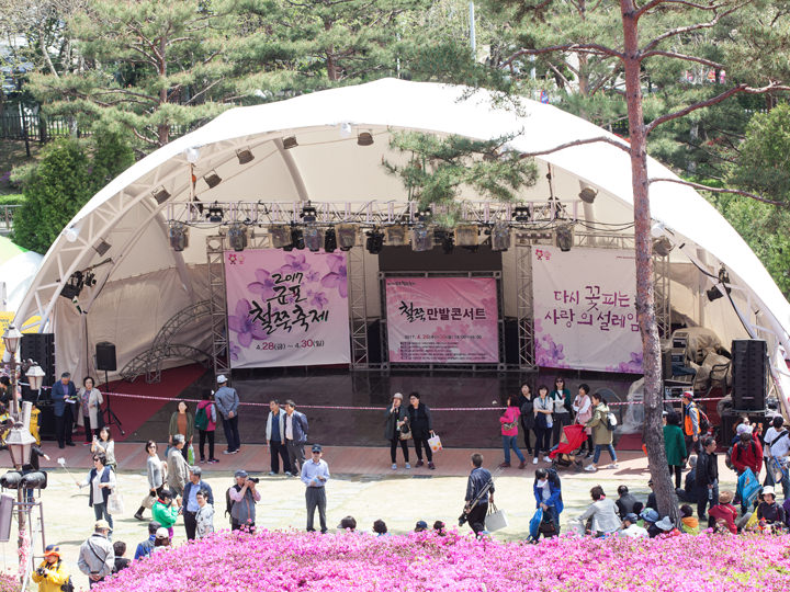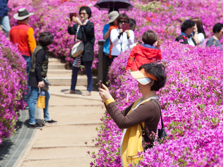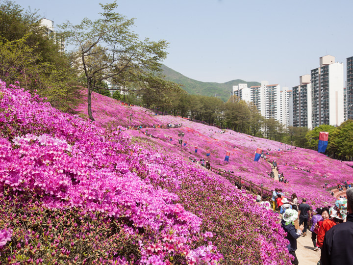 京畿道(キョンギド)の南部にある都市、軍浦(グンポ)市。毎年春(4月下旬頃)に開催される人気の春の花祭りが「軍浦ツツジ祭り」です。地下鉄4号線の修理山(スリサン)駅近くにあるヤンジ公園がお祭りのメイン会場になっていて、赤やピンク、白色のツツジが色とりどりに咲き乱れ、屋台やフードコート、ステージではイベントなどがたくさん催され、毎年多くの観光客が訪れます。修理山駅までは明洞(ミョンドン)駅から4号線で21駅、約50分と距離がありますが、一面に広がるツツジを見れば、わざわざ見に来て良かった!と思えることでしょう。
