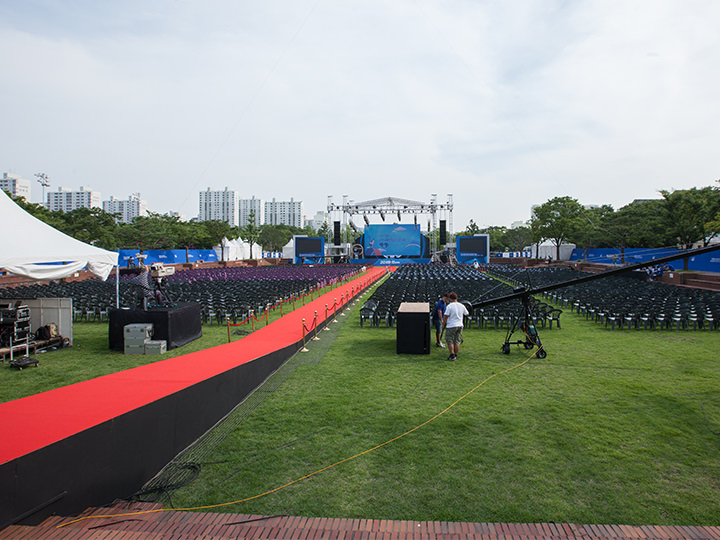 ソウル市と仁川(インチョン)市に挟まれた富川(プチョン)市は、アパートが立ち並ぶベッドタウンとして知られています。地下鉄7号線の富川市庁(プチョンシチョン)駅すぐの所にある「富川市庁」は、富川市の市役所で、富川市の行政中心地です。毎年7月に、釜山(プサン)や全州(チョンジュ)と並ぶ人気の国際映画祭「富川国際ファンタスティック映画祭」が開催され、富川市庁の中央広場では、開会式のセレモニーが華やかに行われ、韓国の俳優はもちろん、世界各国からの有名スターたちのレッドカーペットイベントを一目見ようと、多くの映画ファンが訪れます。