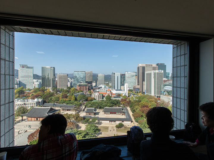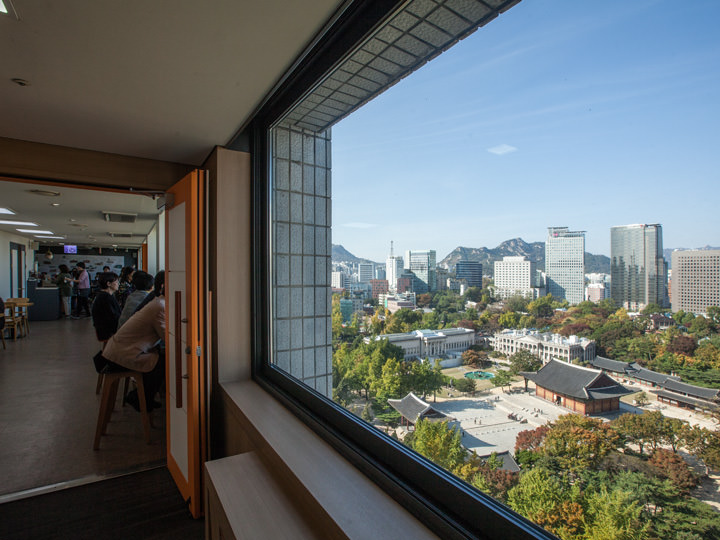 ソウル中心部、地下鉄1・2号線市庁(シチョン)駅の近くに位置する「ソウル市庁 西小門(ソソムン)庁舎」。1棟庁舎13階に、一般市民も利用可能な「貞洞(チョンドン)展望台」があります。これはソウル市が「共有都市ソウル」というプロジェクトの一環で、大会議室の一部と備品倉庫を展望台として開放されたもので、大きな窓からは眼下に「徳寿宮(トクスグン)」「徳寿宮トルダムキル(石垣道)」などを見下ろすことができ、ビルの合間からは「ソウル市庁」「景福宮(キョンボックン)」「仁王山(イナンサン)」なども見えます。またテーブルと椅子が設置されたカフェもあり、コーヒー片手に休憩するのにもピッタリ。1階で身分証明書を提示し、入庁証を受け取れば誰でも利用可能です。