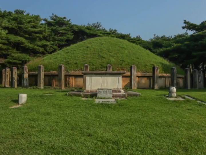 韓国の三国時代の新羅(シルラ、しらぎ)の第42代、興徳王(フンドッワン)の陵墓で、「史跡 第30号」に指定されています。有名な「武烈王陵(ムヨルワンヌン)」とともに、墓に眠る王族名が明らかになったお墓で、興徳王は、唐との関係強化に努めたと伝えられる人物です。場所は、慶州(キョンジュ)市の北部、安康(アンガン)と呼ばれる地域にあり、近くには「慶州良洞民俗村」があります。円墳の周りには多数の石造物が作られ、王の権威を象徴し、陵を守護するものになっていおり、うっそうと茂る松林の中に、独特な趣きをかもし出しています。
