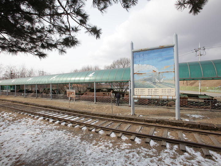 江原道(カンウォンド)・鉄原(チョロン)にある鉄道駅です。開業当時は、ソウル(京城)から元山(ウォンサン)までを結ぶ京元線(キョンウォンソン)にある途中駅でしたが、朝鮮戦争時に爆撃されて廃止。これより北への運行は閉ざされました。駅構内には、戦争時に攻撃を受けた列車の残骸が残り「鉄馬は走りたい」と書かれた看板が話題です。周辺は鉄原平野と呼ばれる平原がひろがり、タンチョウツルが到来することから博物館が駅のすぐ隣にあります。なお、現在の駅舎は鉄原DMZ観光ツアーの一環で1988年に復元されたもので、周辺にある「労働党舎」「第2トンネル」「鉄原平和展望台」などと共に、鉄原DMZツアーの際、立ち寄る場所になっています。