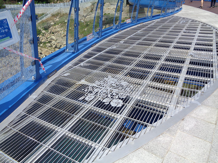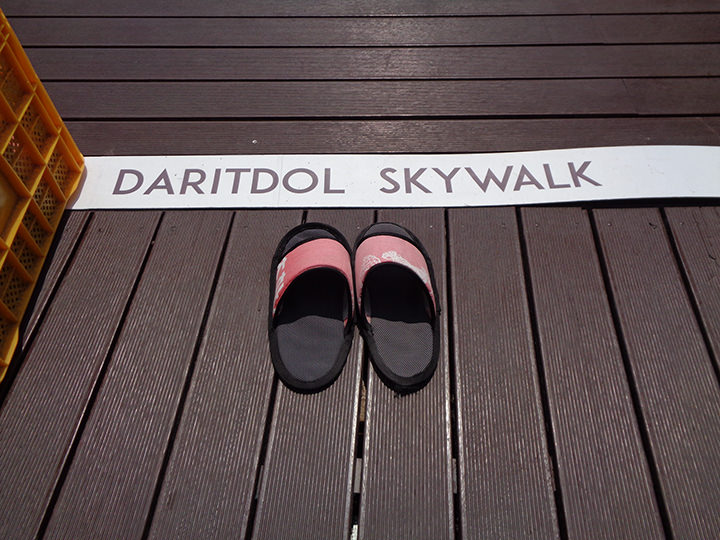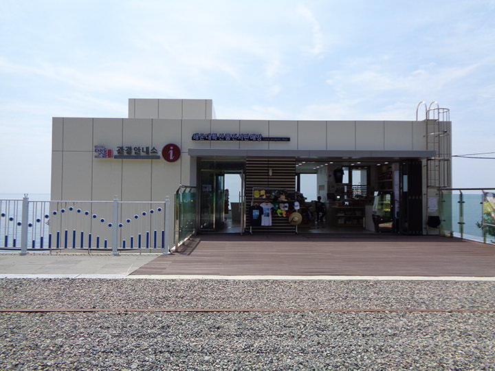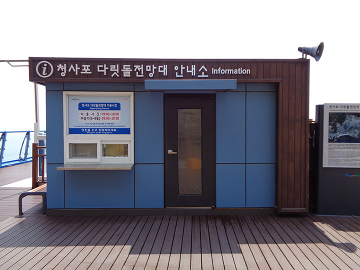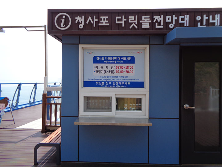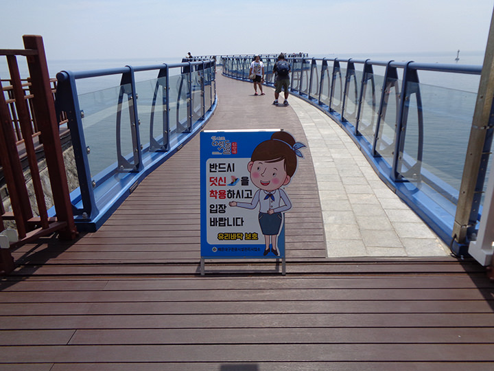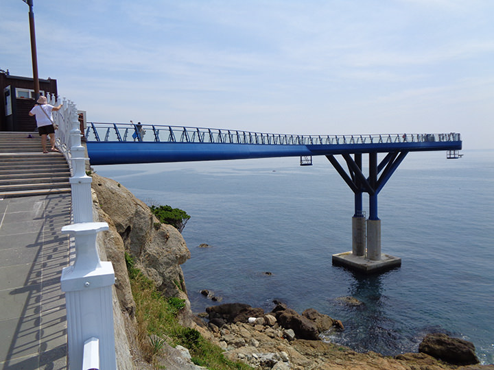 釜山(プサン)の東部、海雲台(ヘウンデ)と松亭(ソンジョン)の間にある海沿いに設置された海上展望台で、天気の良い日には日本の対馬も見えるとのこと。2020年からは「海雲台ブルーライン」という海岸観光列車が運行し、途中の「青沙浦乗り場」で途中下車して立ち寄れる観光名所になりました。デッキの足元はガラス張りで透けているので海が見えるようになっていてスリル満点。入口でシューズカバーを着用して入ります。この辺りは青沙浦(チョンサポ)と呼ばれる場所で、刺身店やうなぎ店、オーシャンビューが人気の展望カフェなどがあるので、展望台周辺で釜山グルメも味わってみましょう。