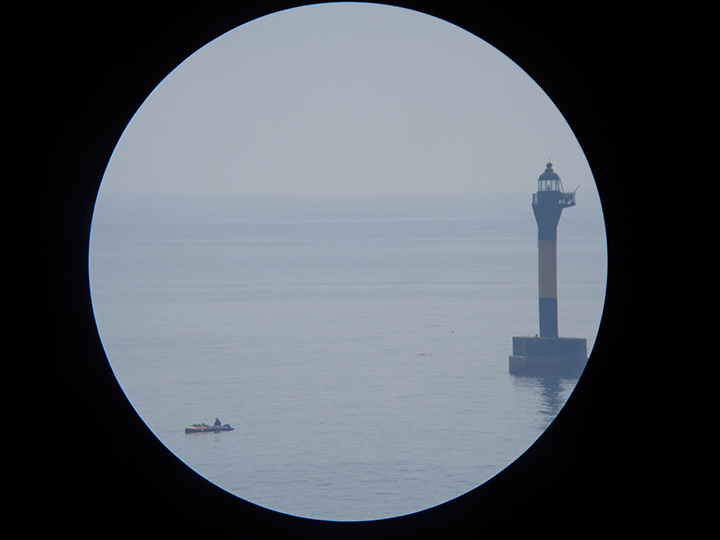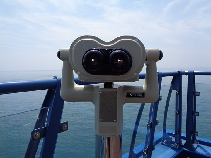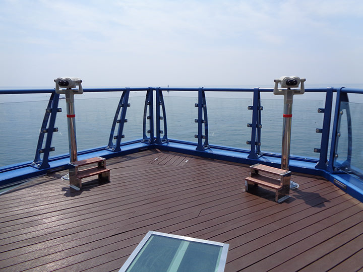 展望台の入り口で靴カバーをしてガラスの上を歩くと、遥か下に海面が見え、その高さを感じます。ガラスの上はまだよいのですが、スマホを手にして金属の網の上に立つと、スマホを落としそうで緊張します。展望台には無料の望遠鏡があり、浅瀬の岩や遠くの景色がよく見えました。
