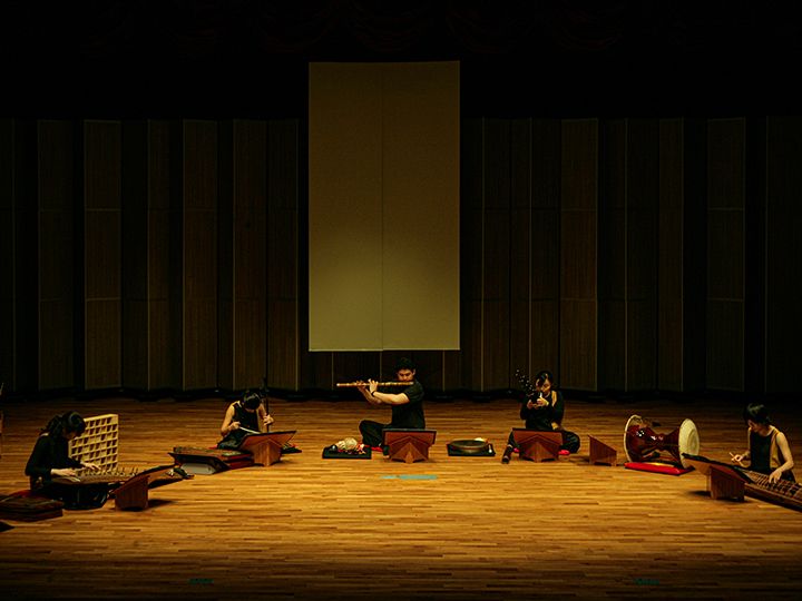 韓国固有の弦楽器、打楽器、管楽器で構成された国楽版オーケストラの演奏を