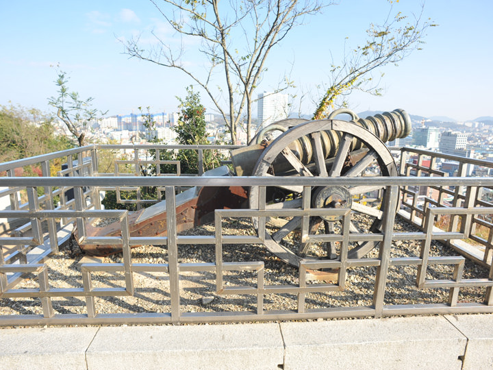 麓の木浦近代歴史館横の階段から登り、李将軍銅像や砲台を通過し、なだらかな山道を進みケーブル乗り場を過ぎると木製の階段に変わり、ラストは急な登りになります、