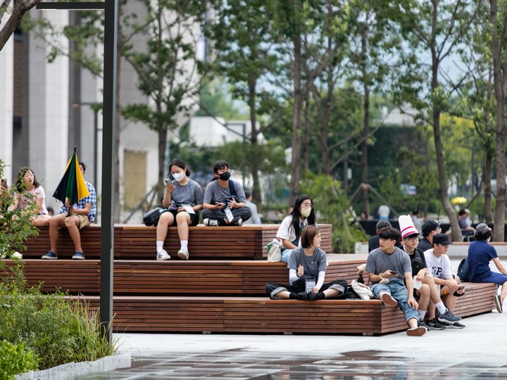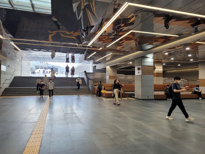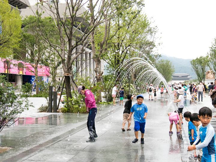 古宮「景福宮(キョンボックン)」の正門「光化門(クァンファムン)」前から市庁(シチョン)方面へと続く道路の世宗路(セジョンノ)。ソウルの心臓部ともいえる道路に「光化門広場(クァンファムンクァンジャン)」があります。豊臣秀吉の朝鮮出兵の際に対峙した朝鮮水軍の李舜臣(イ・スンシン)将軍や、ハングルを創製した世宗(セジョン)大王の銅像があるほか、18mの高さまで吹き上げる約200個の噴水と100個あまりの床噴水が地上に、広場造成中に発掘された地盤の一部や世宗大王の功績を紹介するコーナーが地下にあります。場所は地下鉄5号線の光化門駅からすぐとアクセスは抜群。2022年8月に西側まで広場が拡張され、より広く、快適な空間となりました。