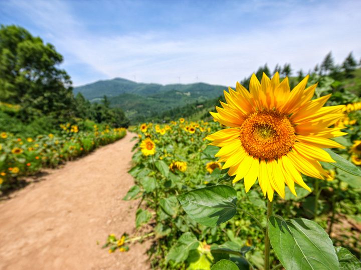 江原道(カンウォンド)の山間部の都市、太白(テベッ)市の中心部から、北へ約5キロ進んだところにある高原自然植物園です。「九臥牛村(クワウマウル)」という村の名前は、9頭の牛が横たわっているような風景というのが地名の由来になったと伝えられています。この村への訪問客が最も多い時期は夏で、一面に咲き誇るヒマワリ畑が全国的に有名。毎年8月上旬に「太白 ひまわり祭り」が開催され、記念写真を撮ってはSNSにアップロードする訪問客で賑わいます。