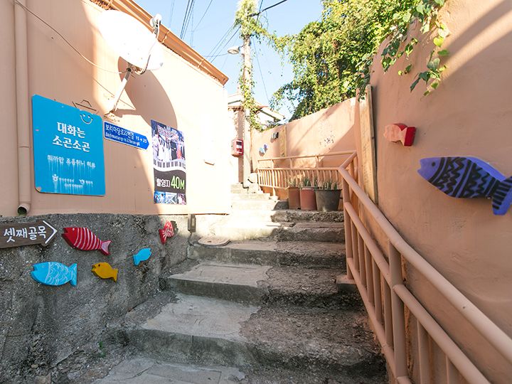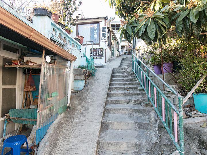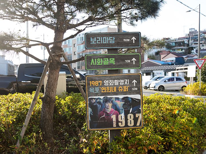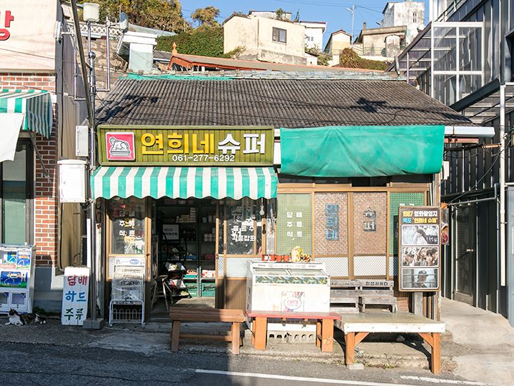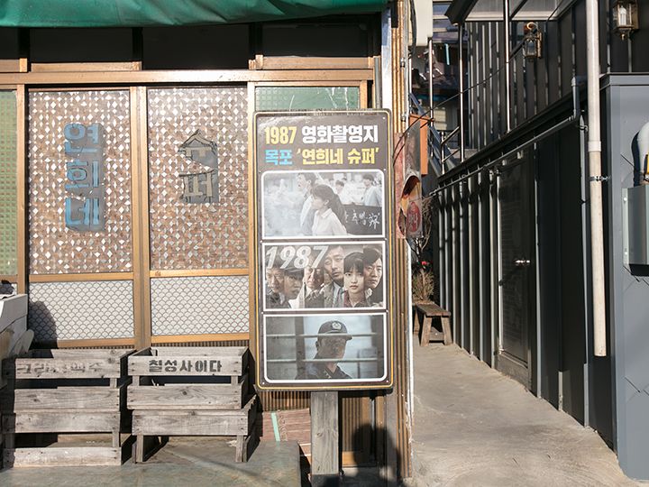 木浦駅近くの「儒達山(ユダルサン)」の山麓にあって、観光客も訪問しやすいエリアに、1960~70年代の古い町並みが残っています。訪問すれば、過去にタイムスリップしたような雰囲気に浸れ、週末になればレトロ好き、写真好きなグループで賑わいます。そんな街並みは韓国映画や韓国ドラマの撮影ロケ地にも採用されはじめ、2017年に公開され、観客動員数を伸ばした韓国映画「1987、ある闘いの真実」で、女優キム・テリが演じた女子大生、ヨニの家の商店「ヨニネスーパー」や、韓国ドラマ「ドドソソララソ」「パチンコ」などさまざまな作品が撮影されています。