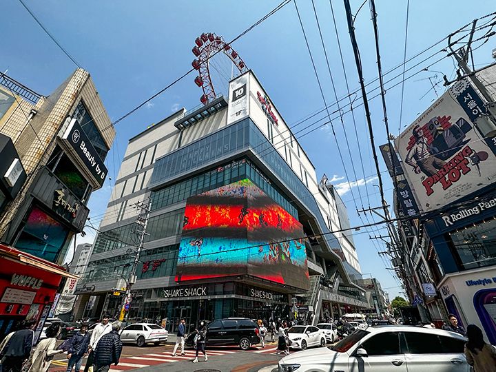 大邱(テグ)市の最大の繁華街は「東城路(トンソンノ)」と呼ばれ、大邱地下鉄の中央路(チュンアンノ)駅から半月堂(パノルタン)駅にかけてホテルや映画館、若者に人気のファッション&コスメショップ、レストラン・カフェが集結。大邱旅行の拠点に便利なエリアです。そんな東城路の繁華街で、ひときわ目立つのがビルの上にある観覧車!これは「スパークランド(Spark Land)」と呼ばれるビルの遊園地で、1~3階はファッション・雑貨。4階はレストラン街、5~6階がファミリー向けの室内レジャー、7~9階が遊園地になっていて、最大の見どころは屋上の大観覧車。目の前のビルを見下ろす車内はスリル満点です。ほかにも様々な施設があり、すべて7階の発券機で1回券を購入しながら利用できます。