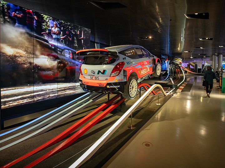 「Hyundai Motor Studio」は、韓国の自動車メーカー「現代(ヒュンダイ)自動車」の体験展示館で、ソウル郊外の高陽(コヤン・Goyang)市のほかに数か所あります。1階ロビーと2階は無料で自由に観覧でき、1階にはカフェのほかに最新車両の展示があり、ドアを開けて運転席や助手席などに座れます。2階にはWRCなどに参戦したスポーツカーやレーシングスーツ、トロフィーなどが展示されているほか、ミュージアムショップではヒュンダイの「H」のロゴが入った雑貨や歴代のクルマのミニチュアなどが買えます。有料コーナーもあり、車の製造過程を韓国語の解説で回るツアーや、4D映像を使った体験館、クルマの試乗、子どもたちの図画工作などは別途、1階の受付にて申し込み・決済が必要です。