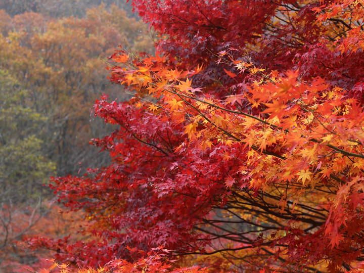 「内蔵山」が登山コースとして人気があることもあいまって、紅葉が色づく頃には各地から個人の観光客や山岳会の団体バスがこの地に押し寄せます。この地域は昼と夜の気温差が大きいため紅葉が鮮やかに色づきます。