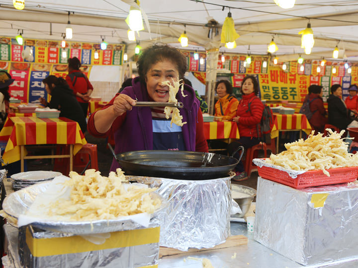 「内蔵寺」に向かう道の両側には露天商のテントが長く続き、大きな松餅や ホットクが店頭に見えます。高麗人参のティギム(天ぷら)を店先で揚げながら売っているお店も数メートル間隔で現れます。「