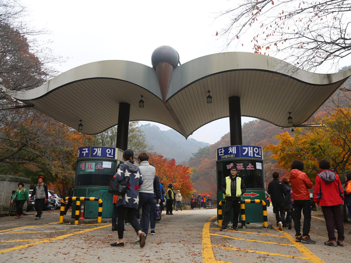 一柱門に行くまでの道のりは木々に囲まれた散策路になっていて、紅葉のトンネルに覆われた道もあります。お寺の入り口までの道を有料バスで移動することもできます。乗り場の横で乗車券を購入して乗り込みますが、このバス何時何分に出発するという決まりはありません。とりあえず人がバスにいっぱいになったら出発しているというゆるやかなシステムに韓国の田舎ののどかさを感じます。